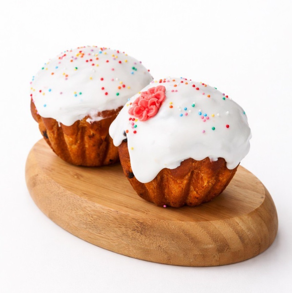 Нежный сдобный кулич с кусочками шоколада в центре. Ароматная выпечка с мягкой текстурой, покрытая сахарной глазурью и украшенная праздничным декором.